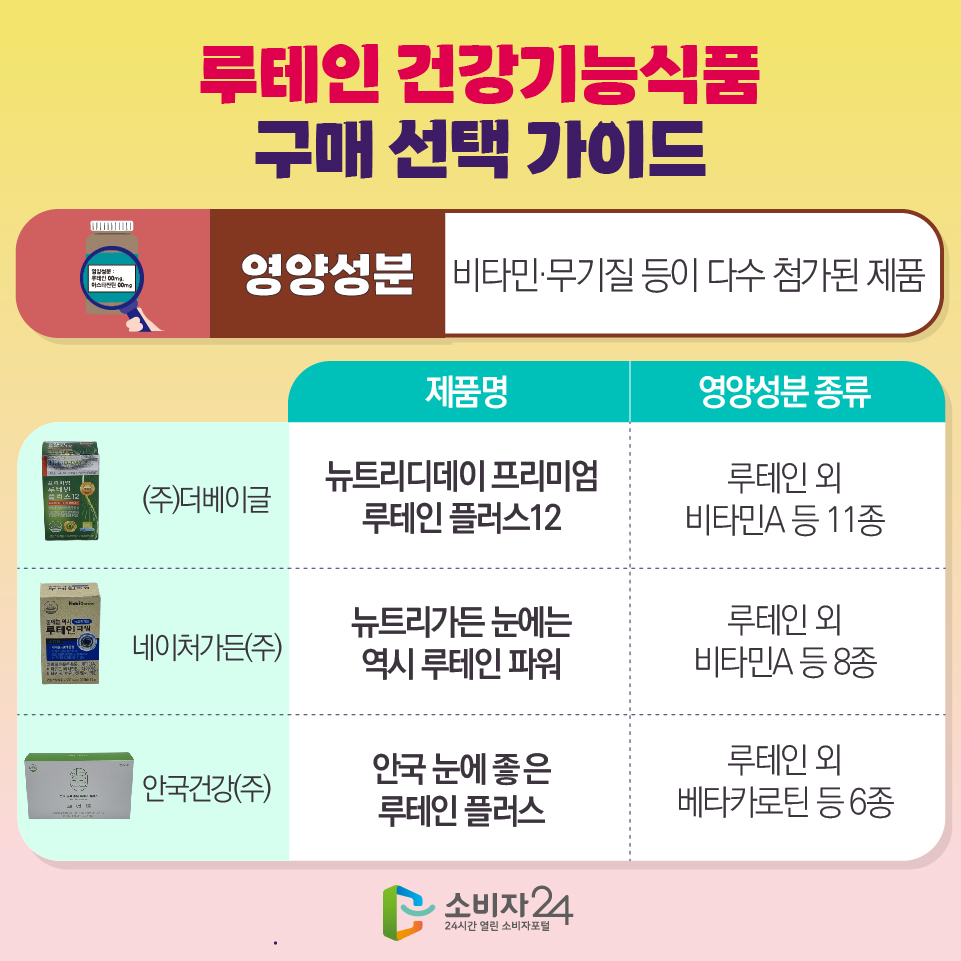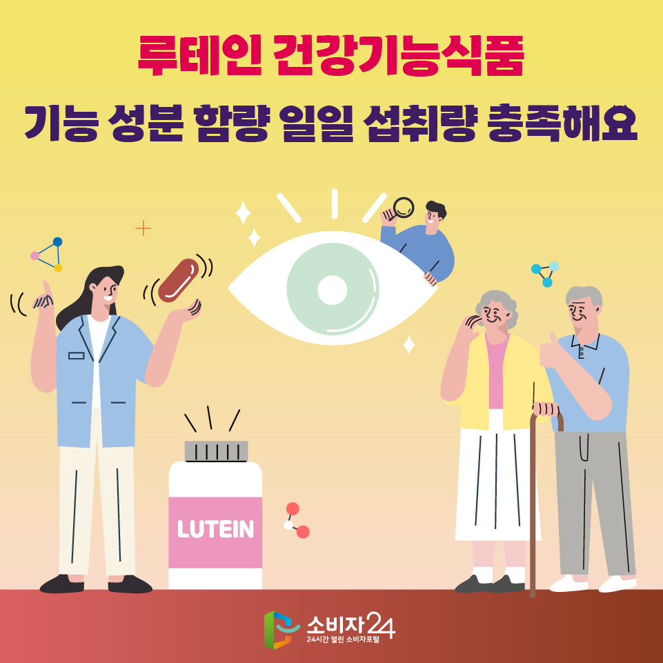 영양제 ‘루테인 건강기능식품’에 관한 가격·품질 비교정보는 ‘소비자24’ 내 ‘비교공감’란을 통해 소비자에게 제공하고 있습니다.
