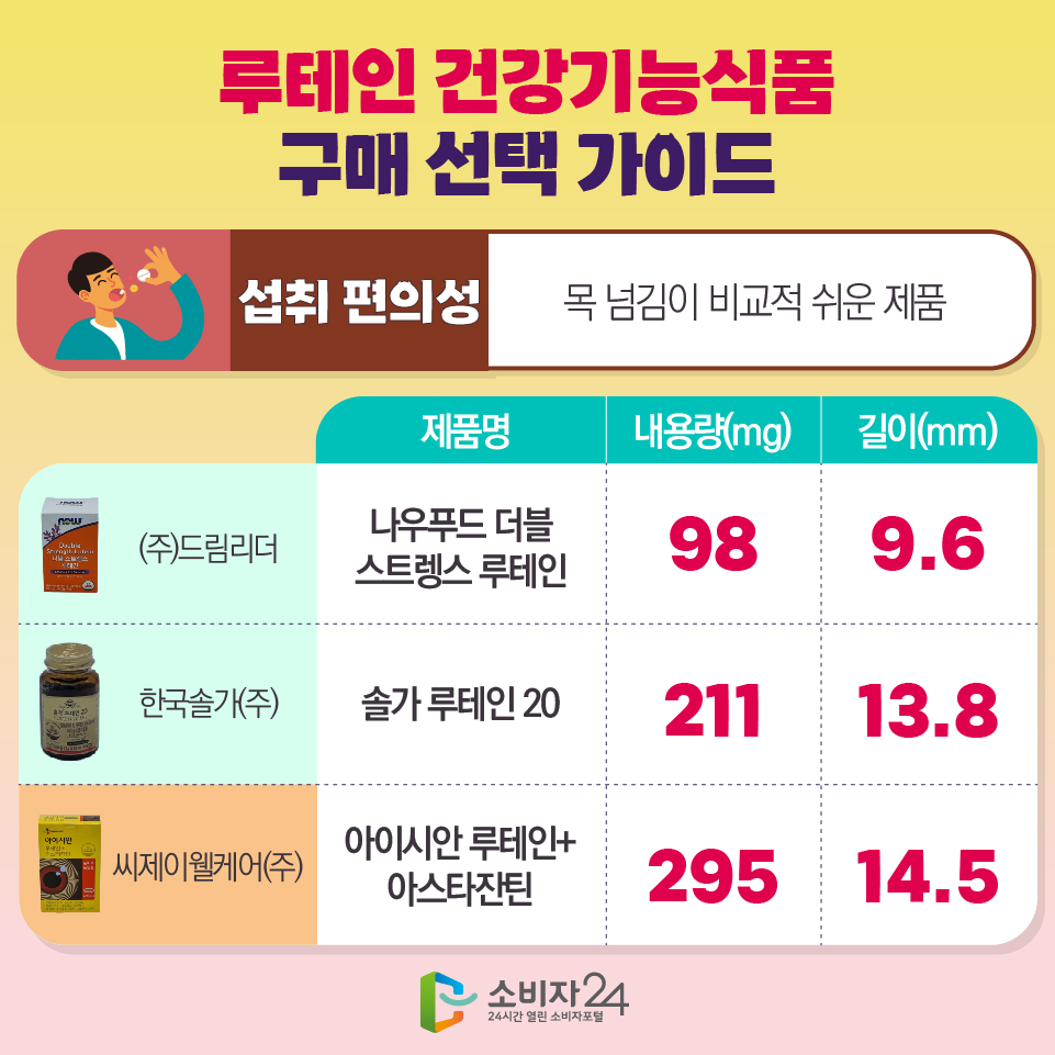 안전성 확인을 위해 실시한 중금속 및 대장균군 시험결과가 기준에 적합했습니다. 또한 섭취 편의성에 영향을 주는 캡슐 크기와 일일 섭취량 가격은 제품별로 차이가 크게 나타났습니다.